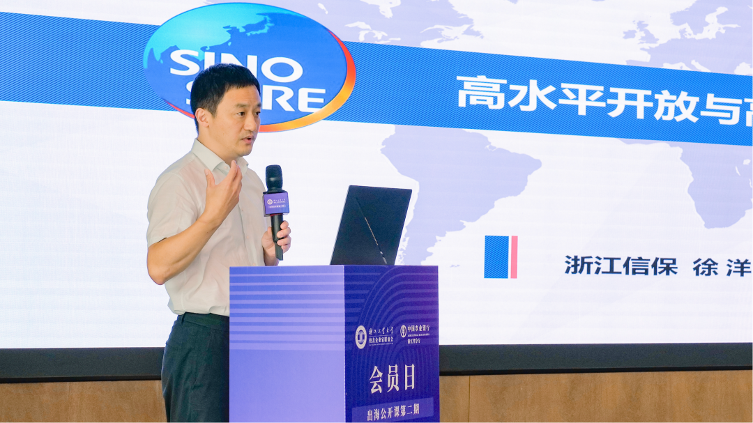 中国出口信用保险公司浙江分公司项目险业务处处长徐洋作题为《高水平开放与高质量“走出去”》的主题分享。他从全球化2.0、技术变量和政策梳理等三个维度高屋建瓴地俯视了当前企业出海的大环境,随后以“出口信用保险”这一国家法定和国际通用的支持企业出海的政策手段为切口,通过真实案例详细介绍了信保产品与服务体系在企业出海过程中所对应的具体业务、支持领域和真实场景。