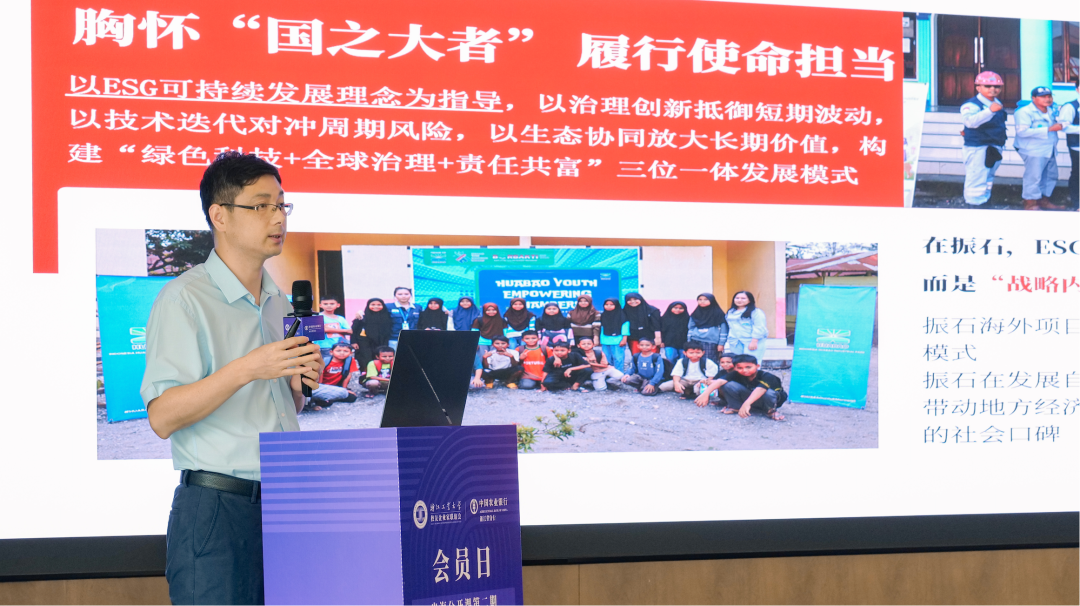 之后,课程正式开讲。首先由联谊会执行会长单位、振石控股集团党委副书记金祥作题为《双链出海全球协同——振石控股集团国际化发展之路》的出海经验分享。基于振石控股集团二十多年来的国际化发展之路,金祥主要围绕“先建市场 后建工厂 以外供外 产销全球”的复合材料产业链和“投资在外 资源用外 支持他国 发展自我”的镍资源产业链的双链出海模式,通过产品出海到产能出海再到资源回流,最后实现全球协同的四个阶段,分享了振石控股集团迈向国际化发展的出海道路、出海感悟和出海挑战。
